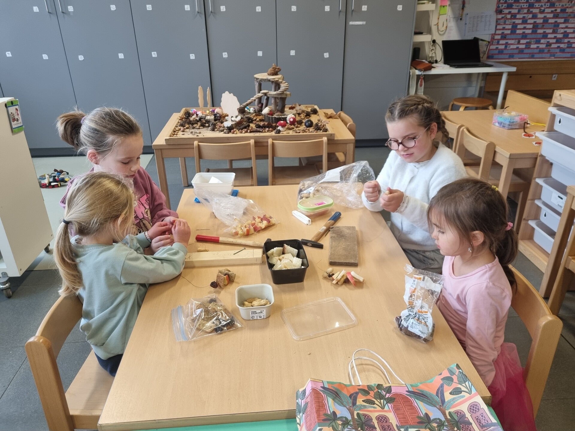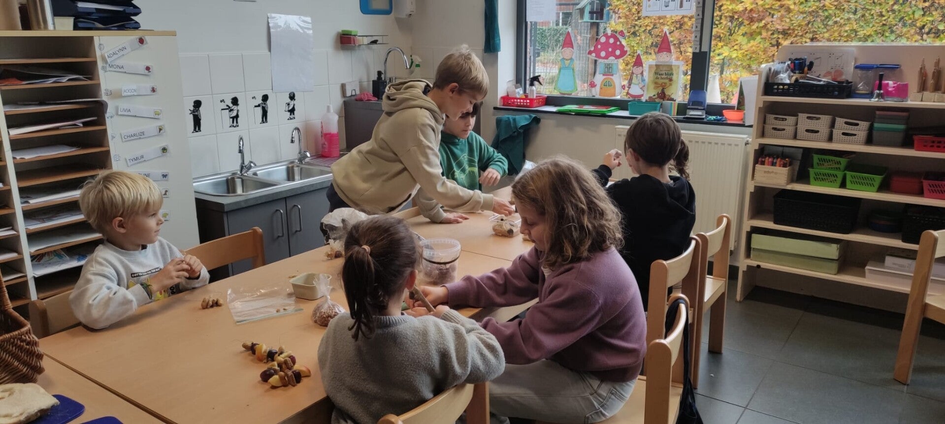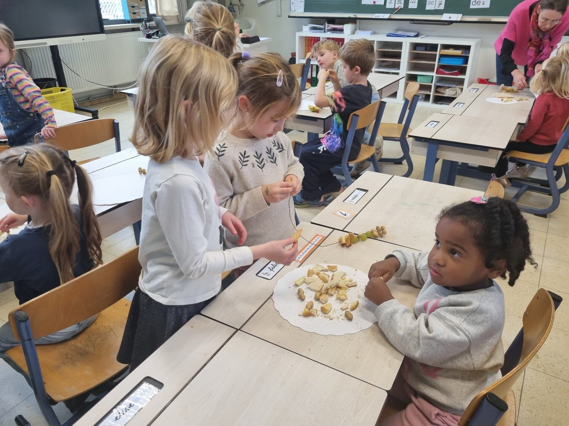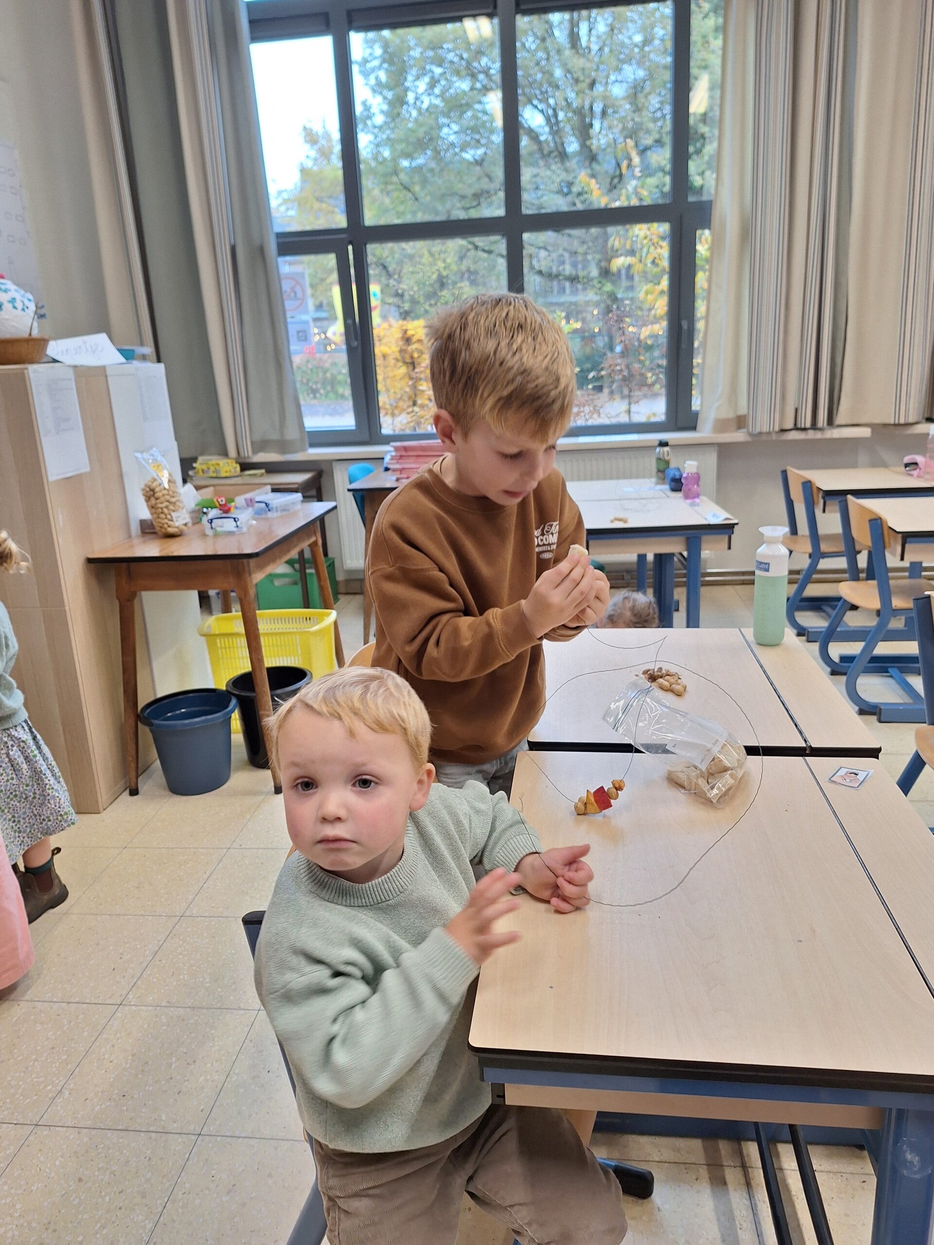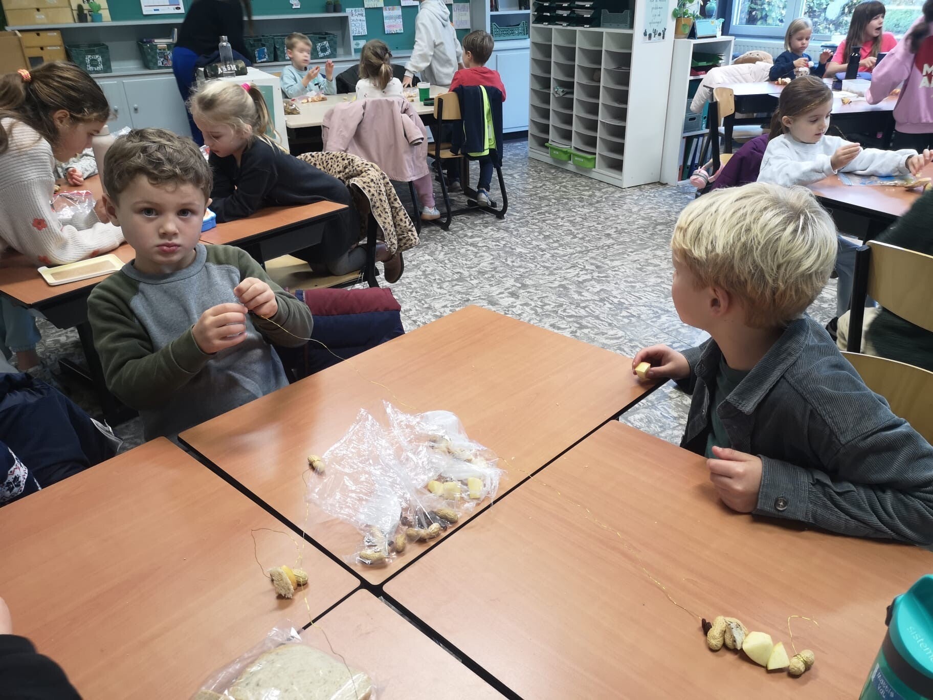 Zo gingen de eerste kleuterklas knutselen met het eerste of tweede leerjaar. De tweede kleuterklas ging knutselen met het eerste of derde leerjaar. De derde kleuterklas ging knutselen met het vierde of vijfde leerjaar.