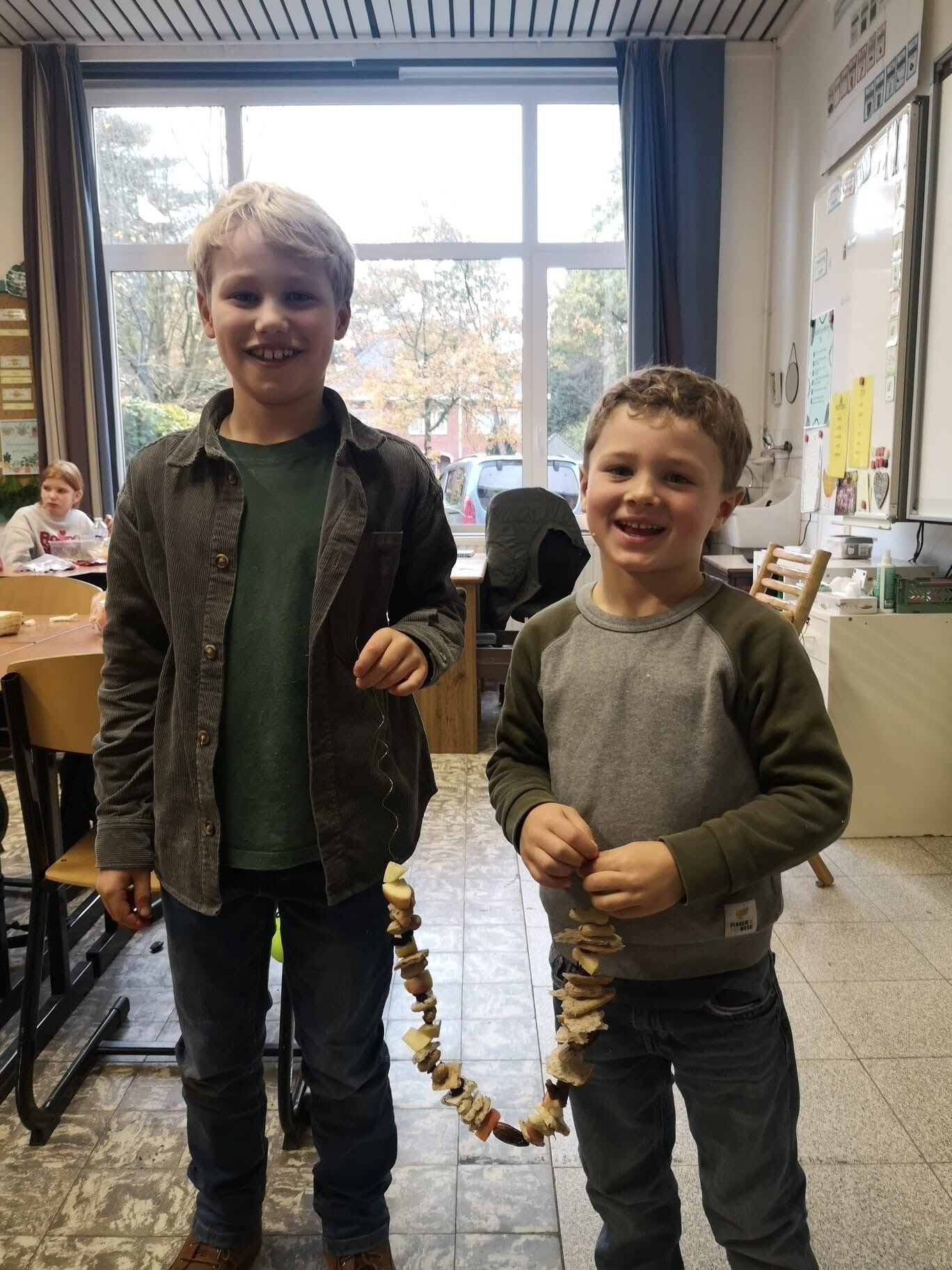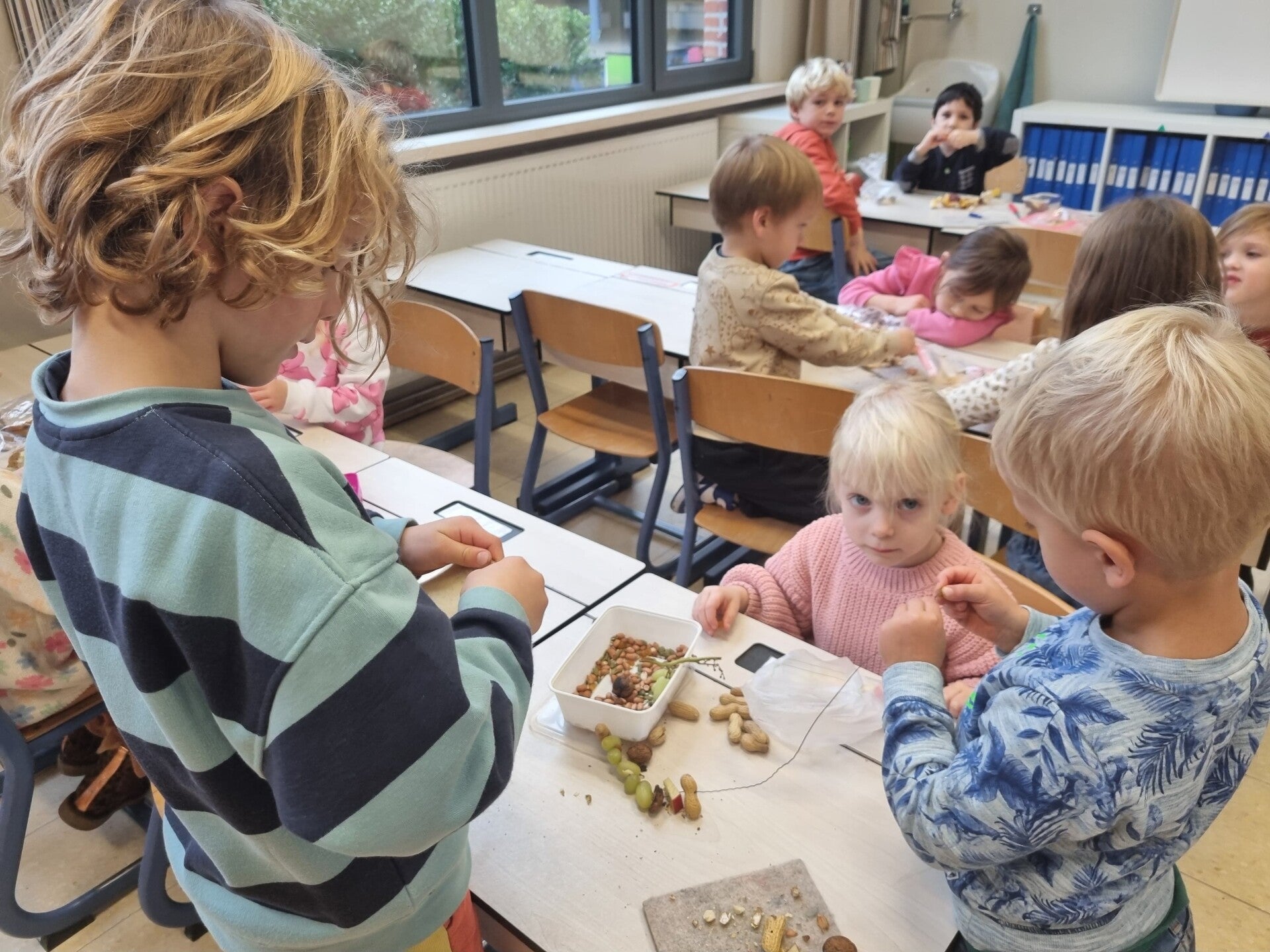 We maakten met heel de school voedselslingers voor de vogels. We koppelden 2 klassen aan elkaar (een kleuterklas met een klas van de lagere school). Met noten, stukjes appels, druiven en brood zorgden we voor lekkere hapjes waarmee de vogels de winter goed doorkomen. Zo helpen we samen de natuur een handje!