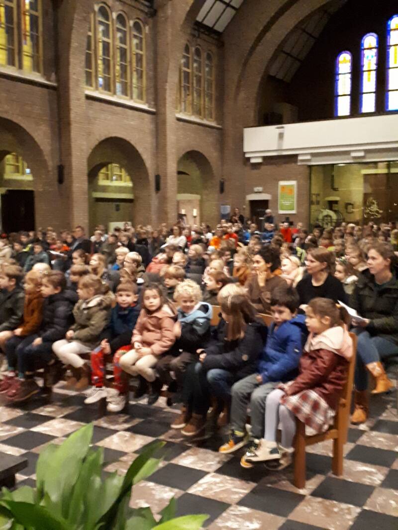 Vrijdag voor de kerstvakantie hielden we onze jaarlijkse kerstviering. Vanaf de derde kleuterklas tot en met het zesde leerjaar was iedereen present!