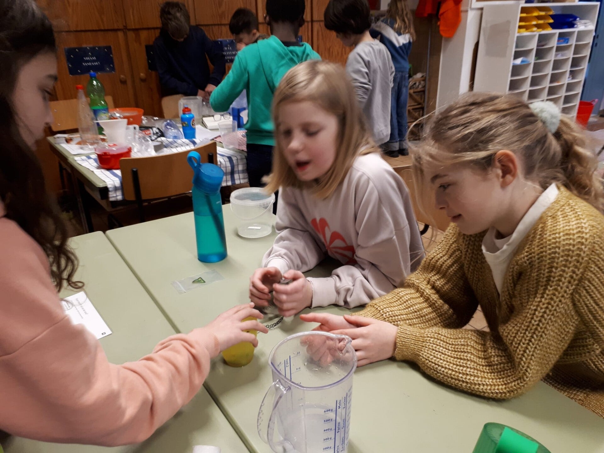 We bouwden samen een parachute om een eitje heel te laten terwijl we het uit het raam gooiden. Dat ging niet bij iedereen even vlot. Een leuk experiment!