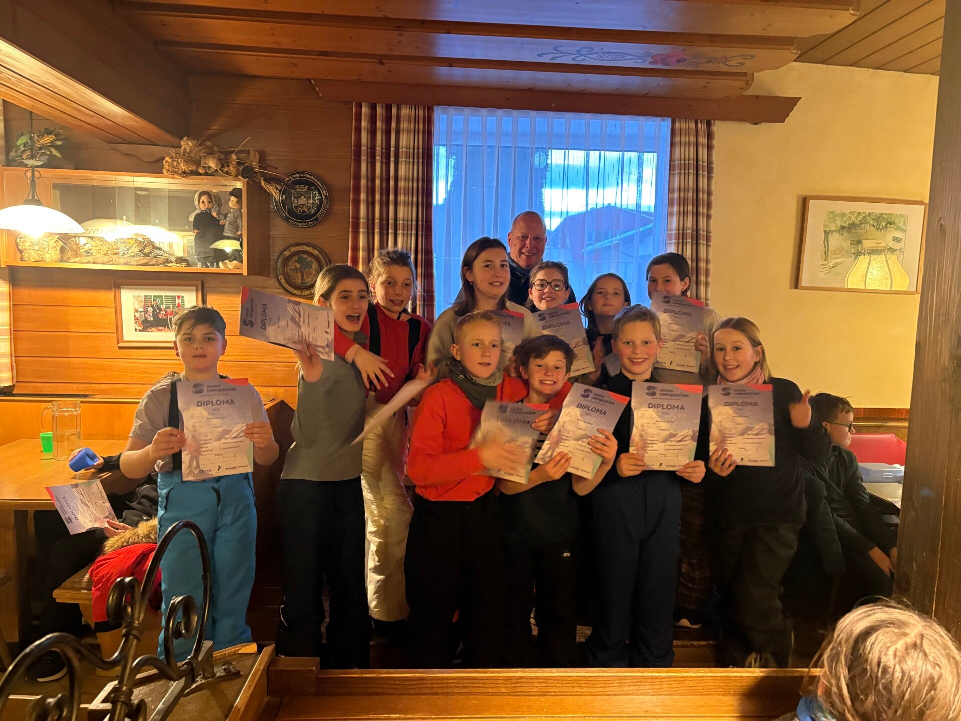 Na een vermoeiende dag op de latten trokken we terug richting het hotel. Daar leverden we de skies en botten in. De bus om ons terug naar Heide te brengen, stond ondertussen ook al klaar. Alvorens we vertrokken, kleedden we ons eerst nog even terug om en genoten we nog van een laatste maaltijd in het hotel. Ook ontvingen alle kinderen een diploma van hun skimonitor.