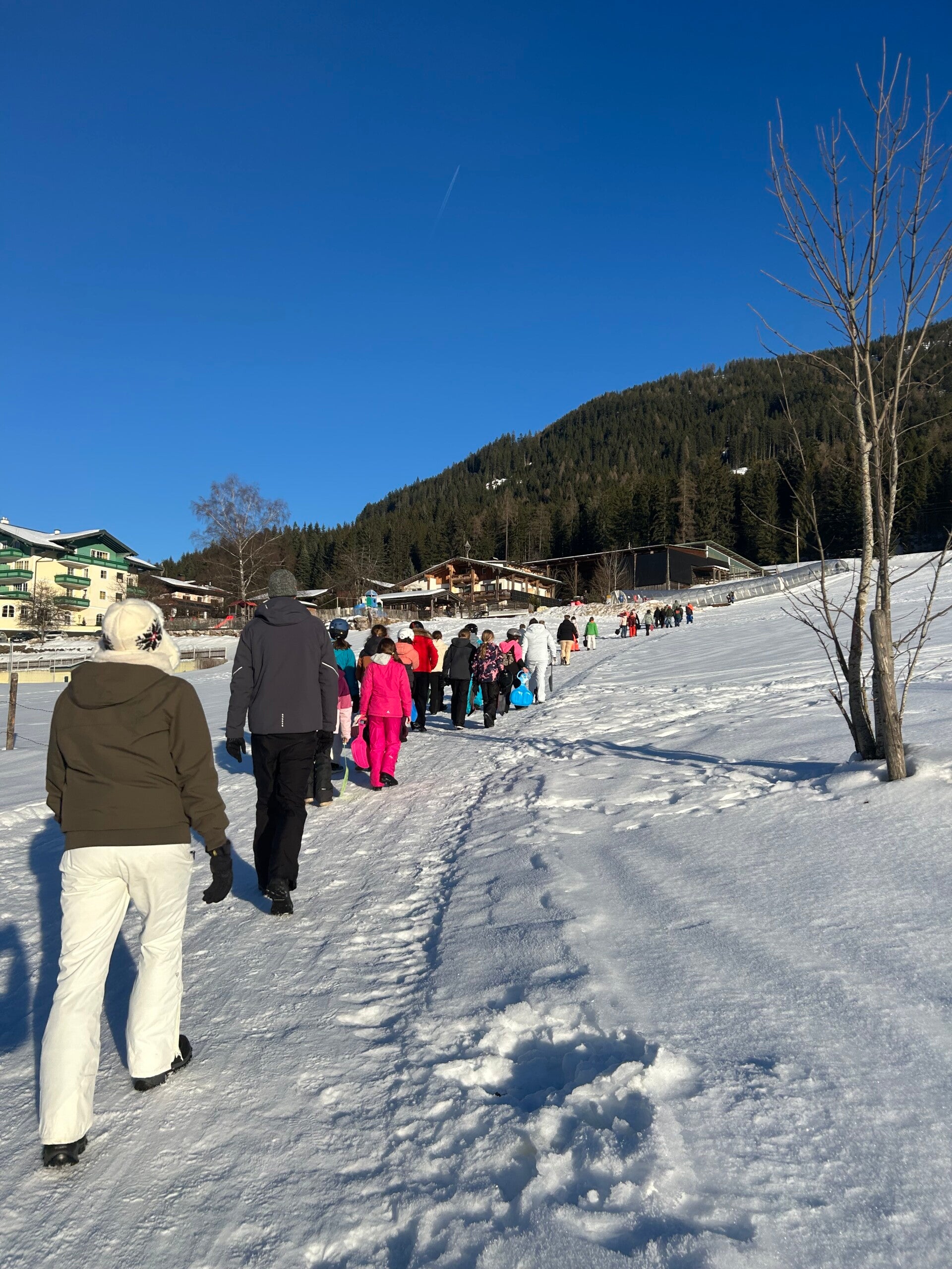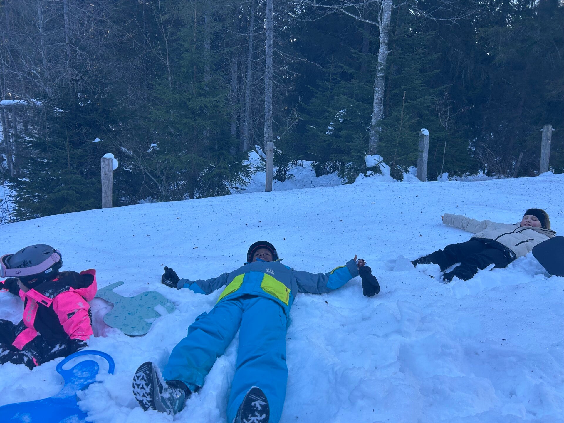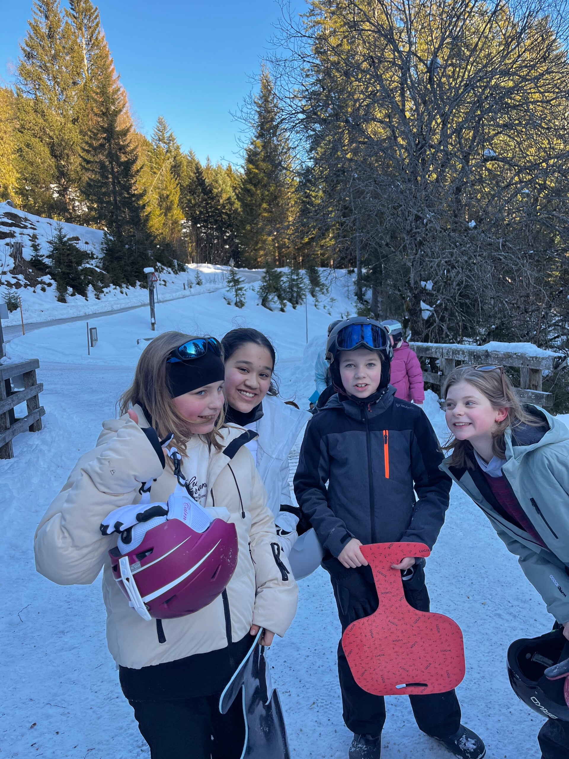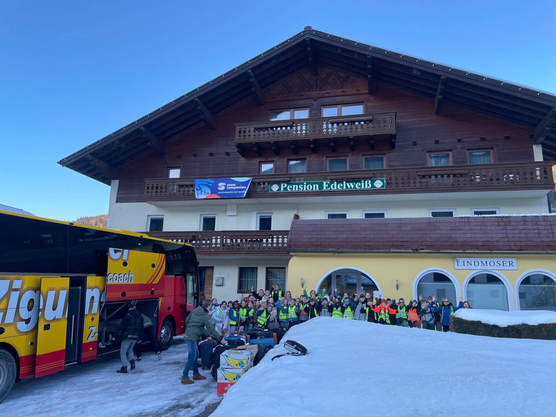 Als tussendoortje keken we nog even een film van ‘The Lion King’ en dan begon de spanning echt. We kwamen aan en meteen kregen we onze kamers. Iedereen was tevreden. Na het sleuren met de koffers was het ski-broek aandoen en naar buiten gaan. Hop, de sneeuw in en wij hadden het echt naar onze zin. We hebben lekker eten gekregen, nog een grote wandeling gemaakte en met de poepsleetjes naar beneden gegleden. We stonden ook op de webcam. Toen we terug waren hebben we een koekje gegeten en ons opgefrist. Daarna was het avondeten om de dag te eindigen met spelletjes spelen en brieven schrijven. Slaapwel!